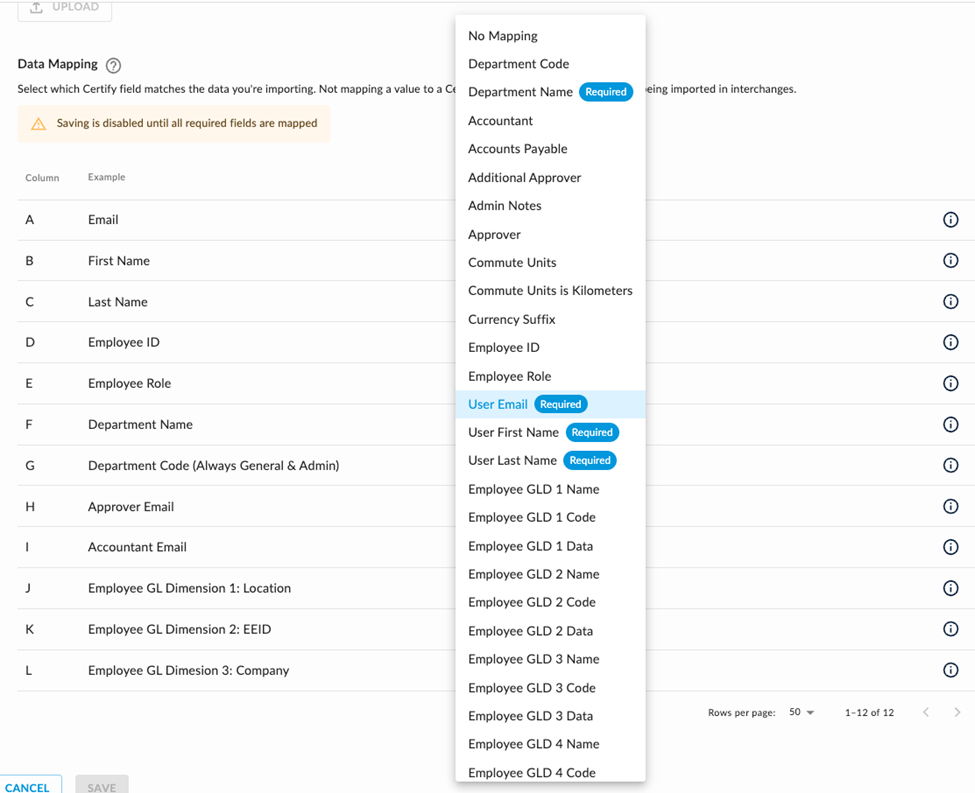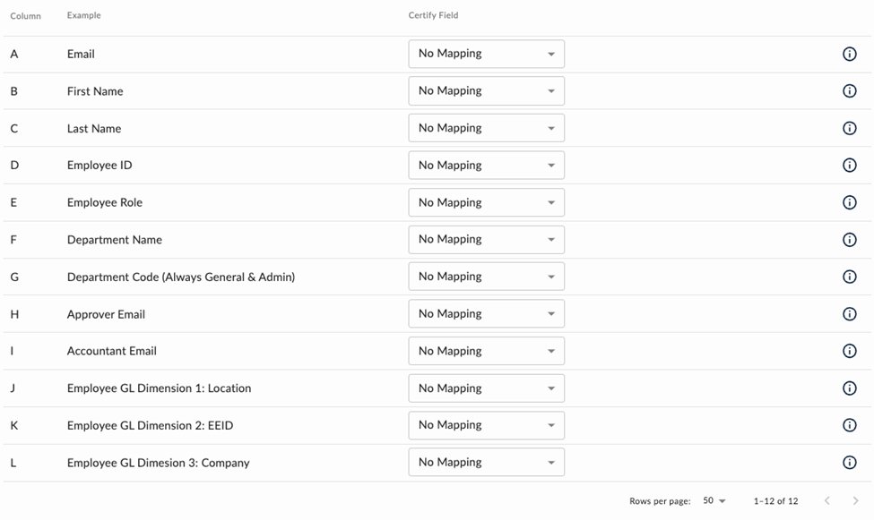 Choose which fields from the file correspond to fields in Emburse Professional by using the drop-down menu pictured. Please Note: Unmapped columns will not be imported in the sync.