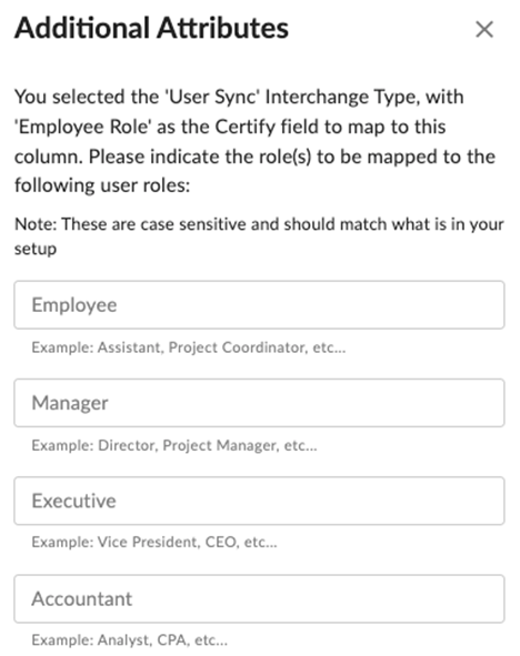 - When setting up a User Sync and mapping a file field to the ‘Employee Role’ Emburse Professional field, additional action is required. You’ll notice an ‘Additional attribute needed’ annotation on the row in question: