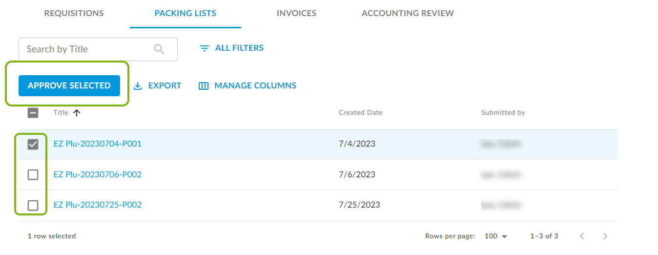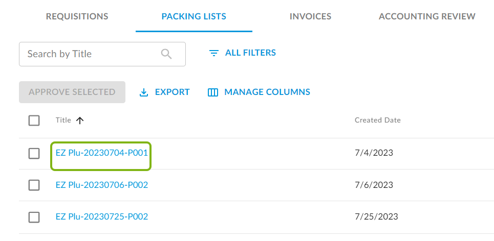 3. To Quick Approve a packing list, click the checkbox beside it. Then, click Approve Selected.