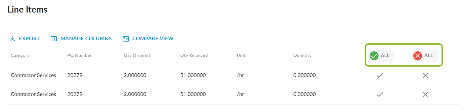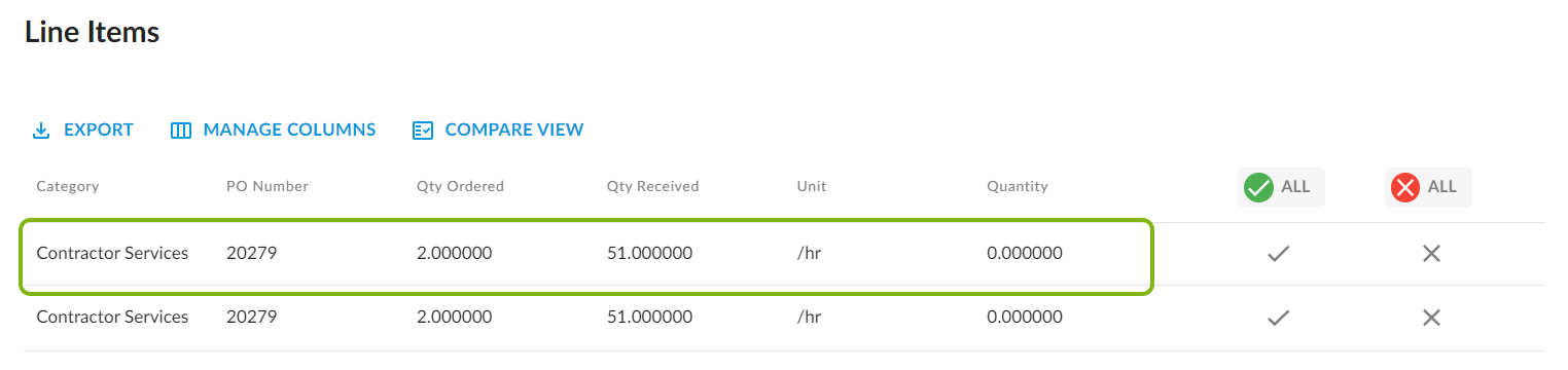 7. To approve a line item, click the checkmark icon. To reject a line item, click the X icon.