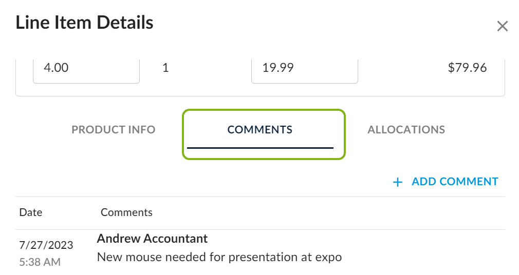 Approvers may also enter their own internal comments on the line item by clicking Add Comment.