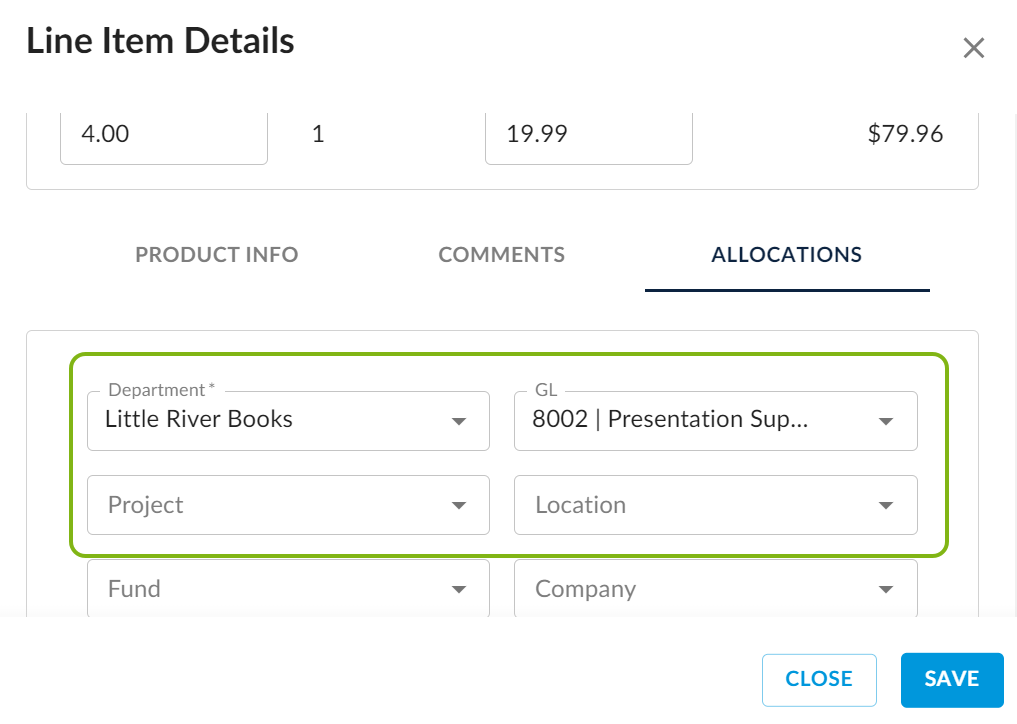 5. Under the Allocations tab in the Line Item Details window, approvers can edit the GL and the Project.