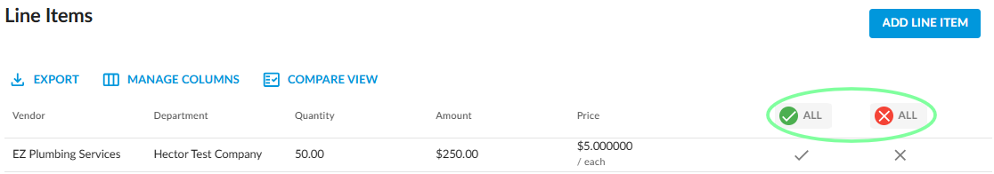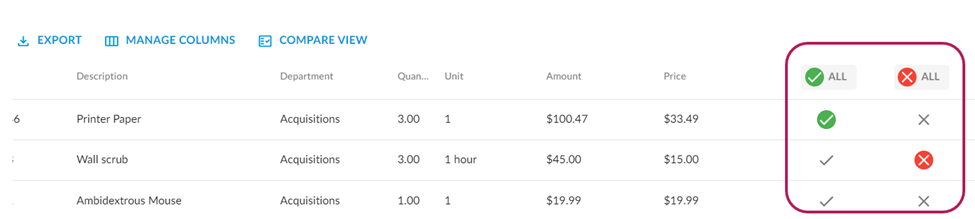 1. Approvers can choose to approve or deny line items individually or all at once. To approve or deny multiple line items at once, click the Green Check or Red X buttons at the top of the column.