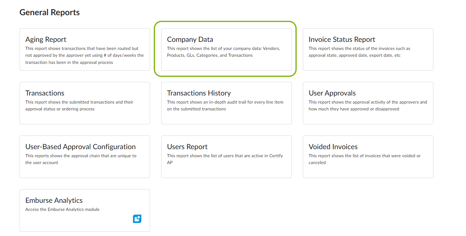 Emburse Professional AP has a large set of reports which enable administrators and managers to analyze spend data. The Company Data Report is a permission based report which allows users to gain visibility into company data, such as Vendors, Products, Accounts, Categories, and Transactions.