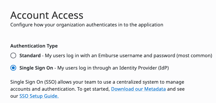 2. Choose between Standard authentication (users will log in with a Emburse Professional username and password) or Single Sign On (users will access Emburse Professional through your company’s Identity Provider).