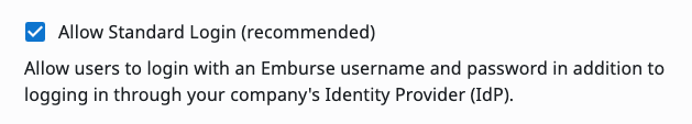3. If you want to allow users access to Emburse Professional using both your IdP and Emburse Professional credentials, select Allow Standard Login.