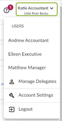 6. The next page will be the user's Emburse Professional account homepage. Any report submission or approval action taken on behalf of the user will be recorded in the Delegate User Actions report. To switch back to your account, open the current user drop-down menu at the top of the user's account homepage and select your name.