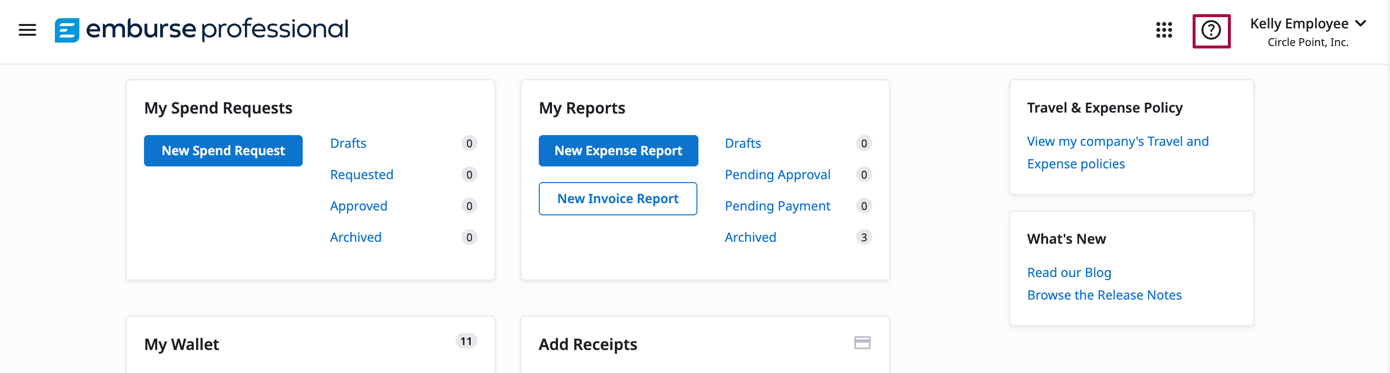 1. From your Emburse Professional homepage, click the question mark icon to access Support.