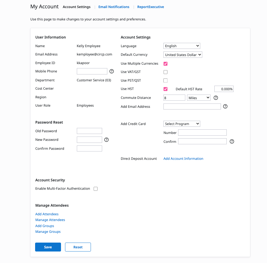 Your My Account page in Emburse Professional contains account information specific to you. While using Emburse Professional, there may be times when you need to update your information. You might switch departments, change your Emburse Professional email address, or your approval workflow may be changed. This information is managed internally by your Emburse Professional Administrator.