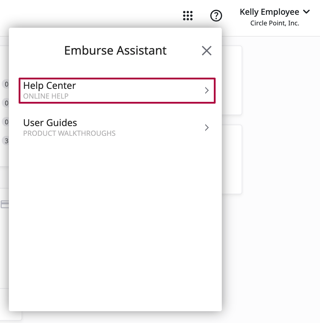 2. This will open the Emburse Assistant window and provide you with the option to access the Help Center or User Guides. Click on Help Center.