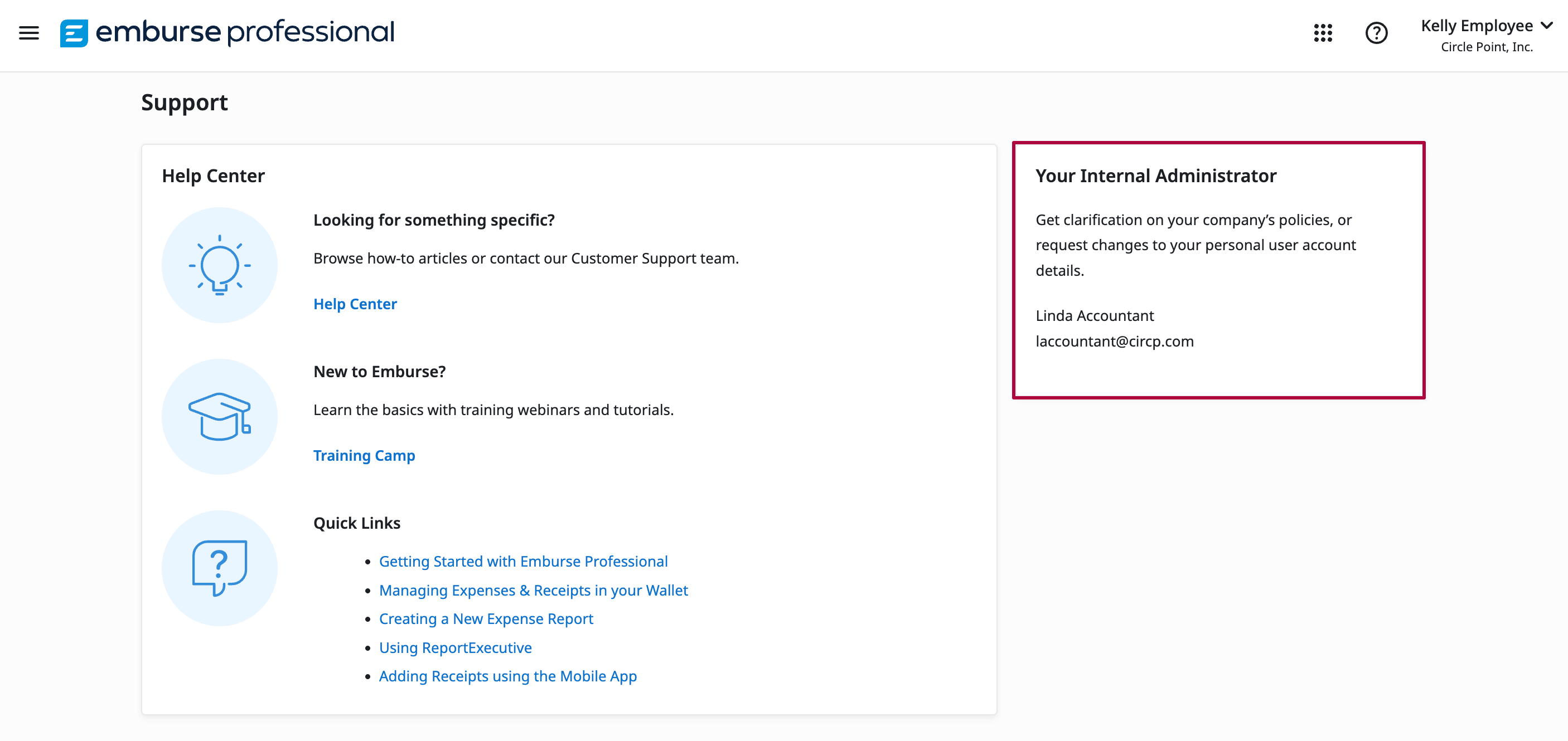 Contact information for your internal Emburse Professional Administrator is located on your Emburse Professional Support page.