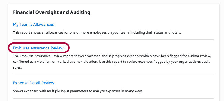 2. Scroll to the Financial Oversight and Auditing section and click Emburse Assurance Review.