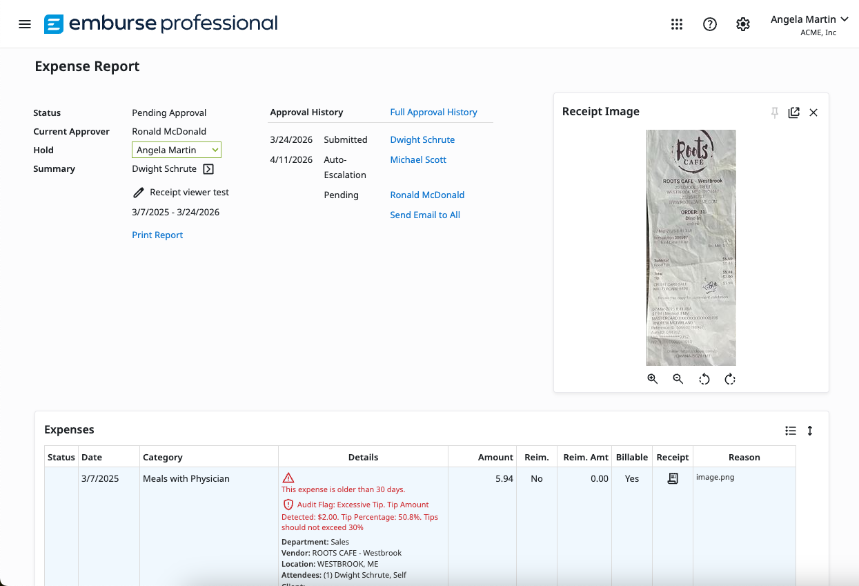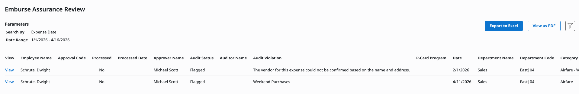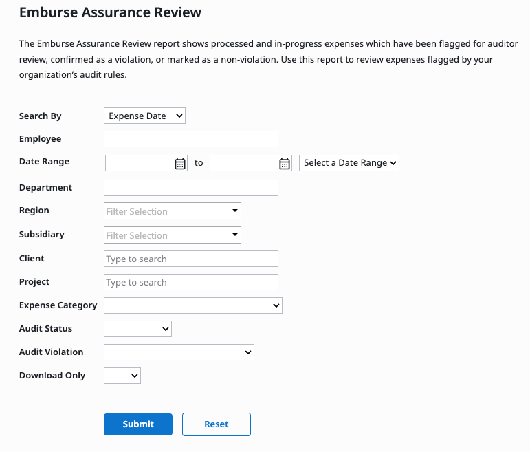 This article shows you, an Emburse Professional Administrator, how to use the Emburse Assurance Review report to work with expenses caught by Emburse Assurance.