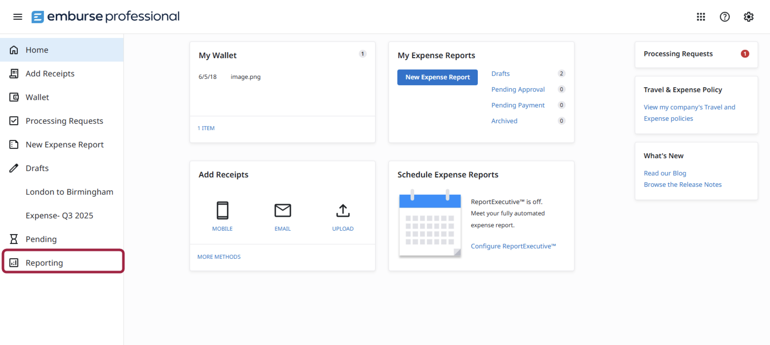 1. From your Emburse Professional homepage, click Reporting.