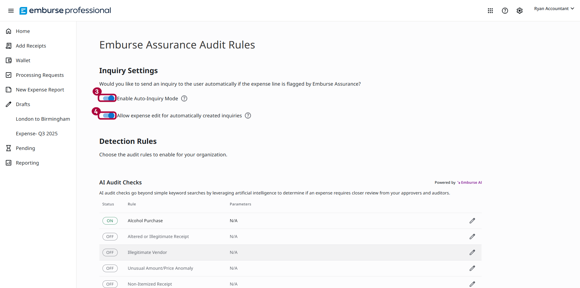 For organizations using Emburse Assurance for Emburse Professional, administrators can configure audit rules to identify and flag expenses based on company policy.