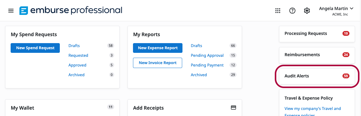 1. From your Emburse Professional homepage, click Audit Alerts.