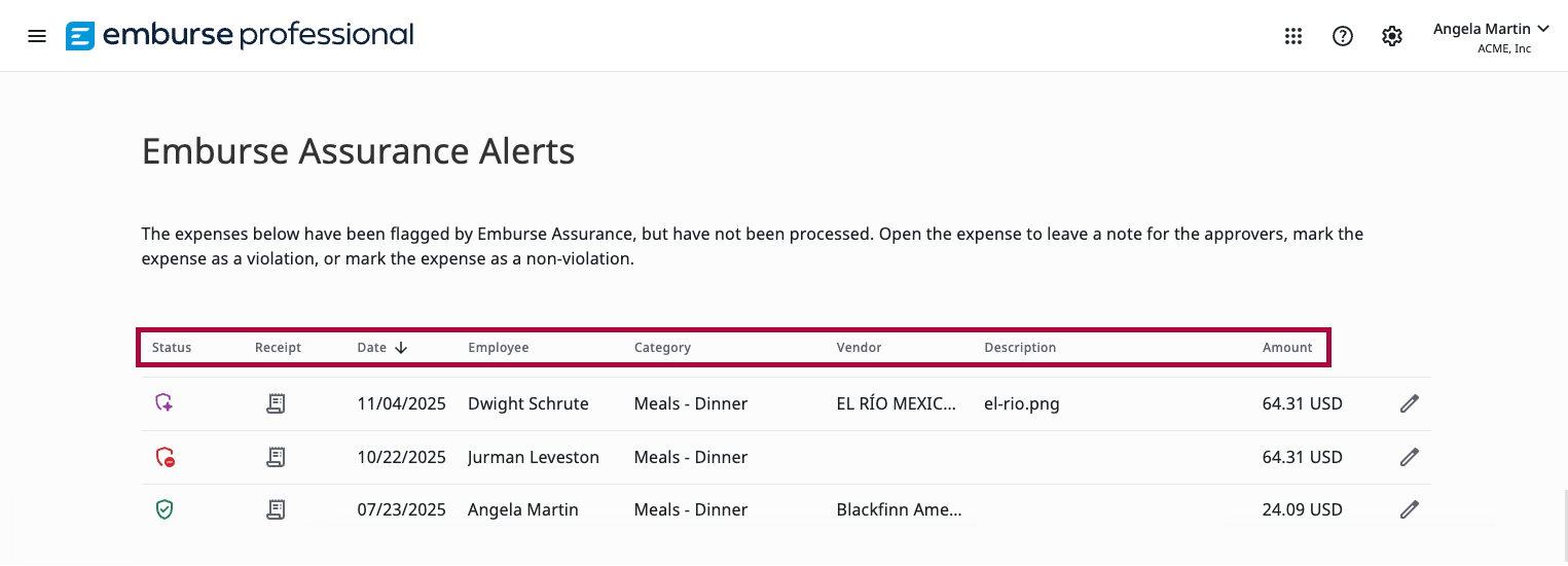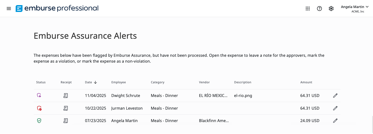2. The Emburse Assurance Alerts queue opens with a list of pending expenses that have been flagged by Assurance.