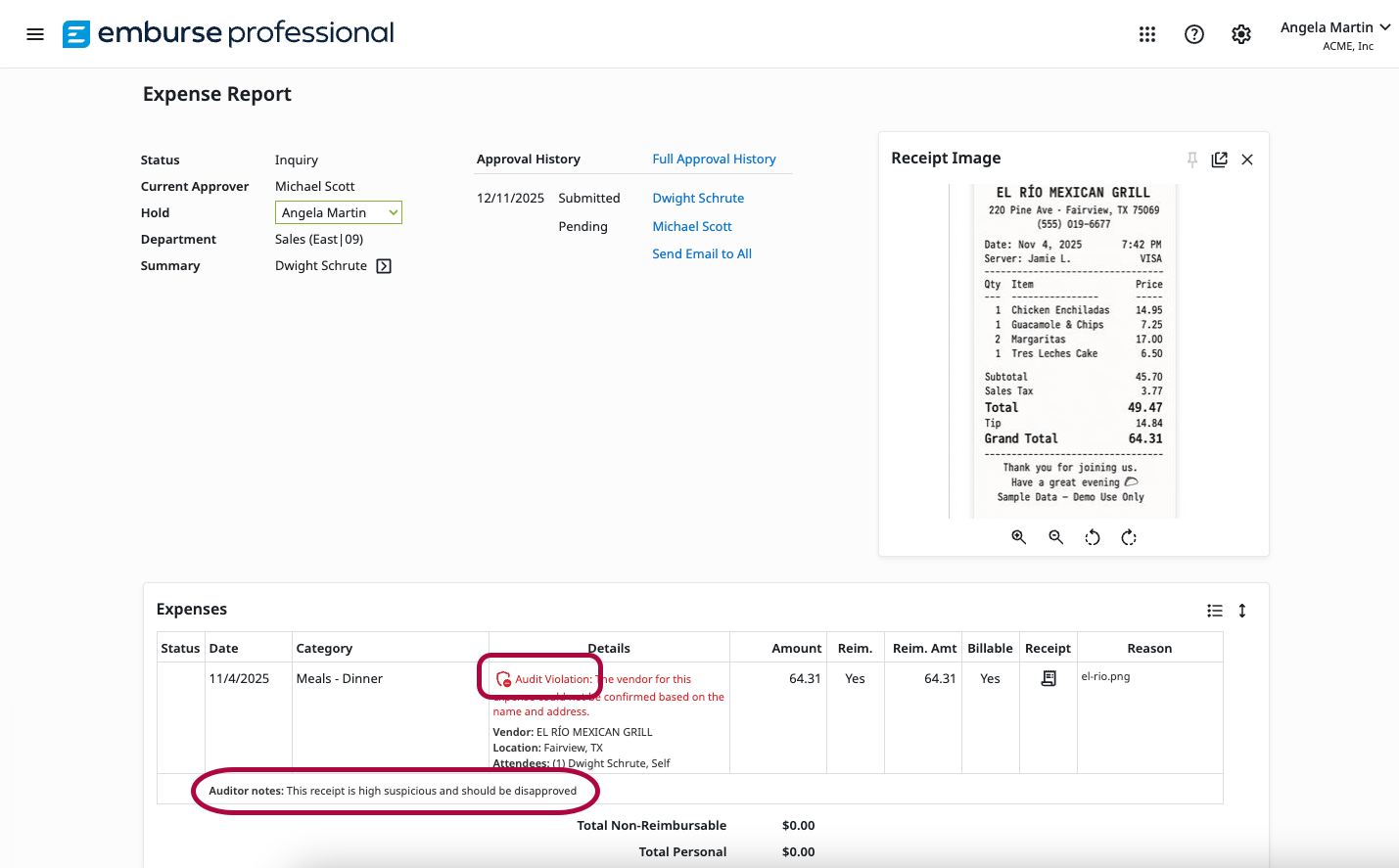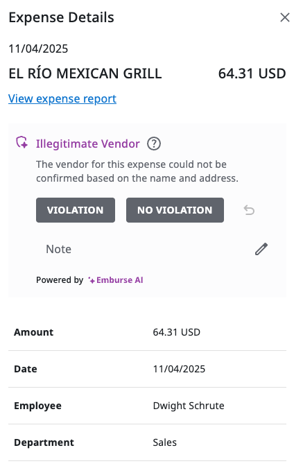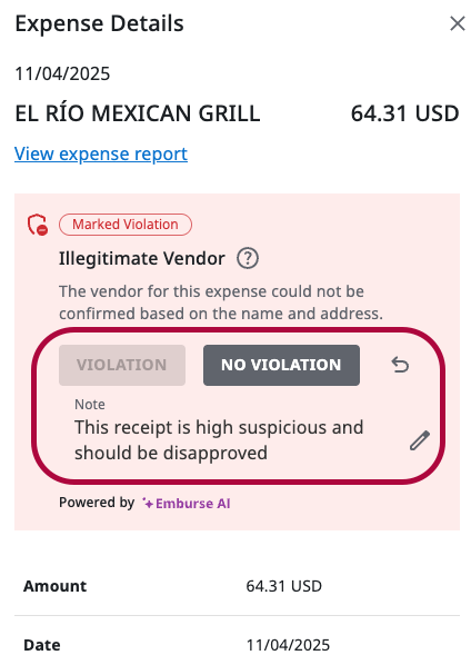 - Red: An Auditor has reviewed this expense and marked it as a violation