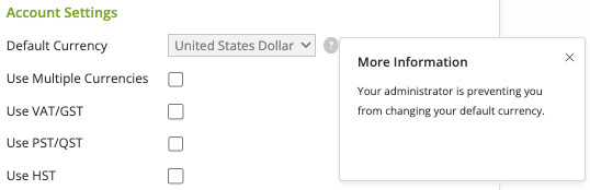 When checked, non-administrators will see that the 'Default Currency' dropdown on the My Account page is grayed out, with a message informing them that they are unable to edit and choose another option. Administrators - both in their own accounts and switching to user accounts - will still be able to edit this field as before.