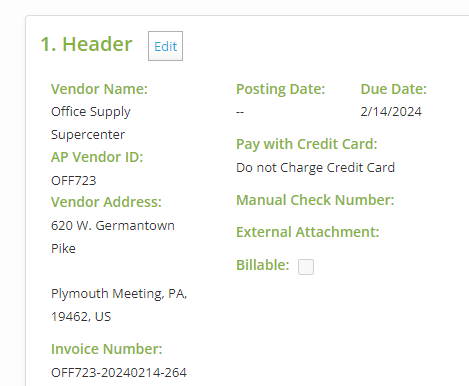 When the invoice submitter creates an invoice, Emburse Professional AP now displays the vendor address and AP vendorID in the Invoice Header.