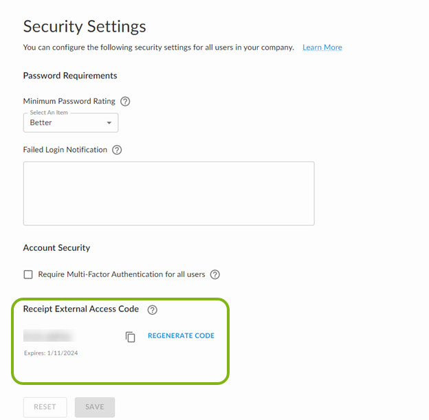 In early 2023, we made security enhancements to how customers share receipt images with non-Emburse Professional users. As part of this work, we introduced the Receipt External Access Code. The access code allows non-Emburse Professional users to view receipt images by entering the access code provided by the customer. This additional level of authentication keeps our customers’ financial data secure while still allowing them to share receipt information with individuals outside of their organization.
