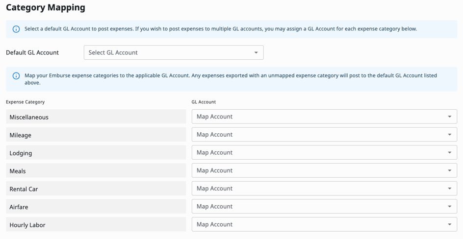 Organizations may also manually map their Emburse Expense Categories to corresponding GL Accounts in Intacct when not using the Expense Type sync. Administrators can set a default GL Account or map each category individually. The offset account is fully configurable as part of the connector, see Map Expense Categories to GL Accounts.