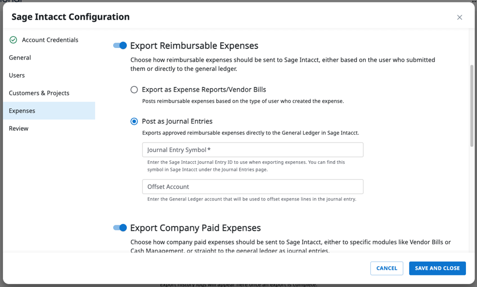 Sage Intacct Connector – Journal Entry Export: Export expense reports as journal entries for broader accounting flexibility.