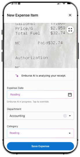 When capturing receipts, OCR powered by Emburse AI starts automatically. If preferred, users can select any participating field to override OCR and enter data manually.