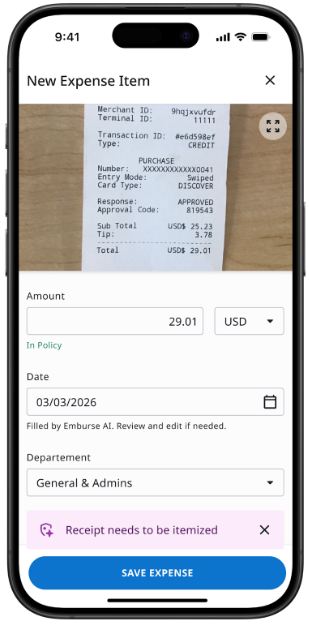 | Non-Itemized Receipt | Detects whether meal receipts over $25 are missing itemized detail. Receipts under $25 are not evaluated for this rule. | Attach an itemized receipt or provide required context, based on policy |