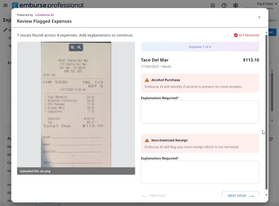 Emburse Assurance adds automated checks that can identify issues that are harder to capture with standard rules alone, like receipt quality problems, mismatches between receipt content and expense details, and patterns that may require additional review.